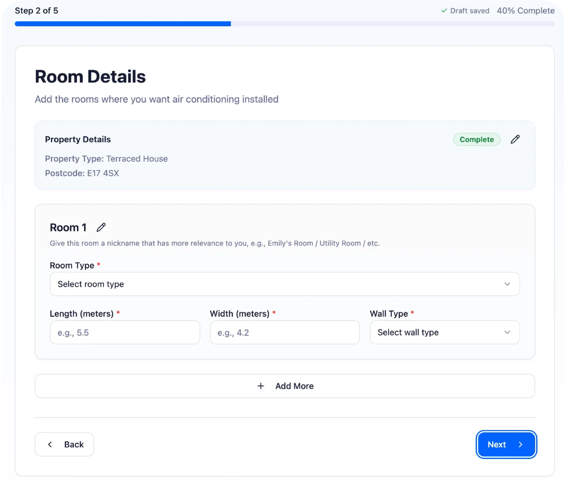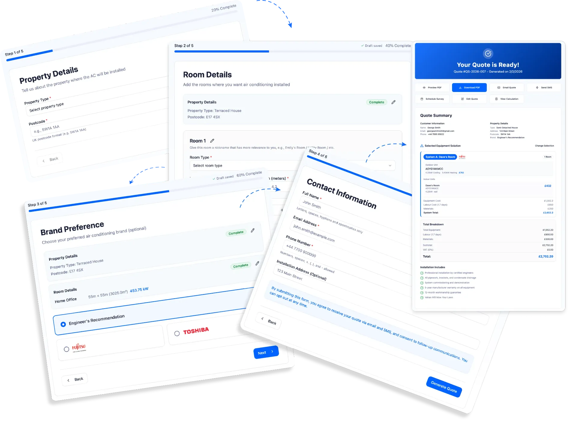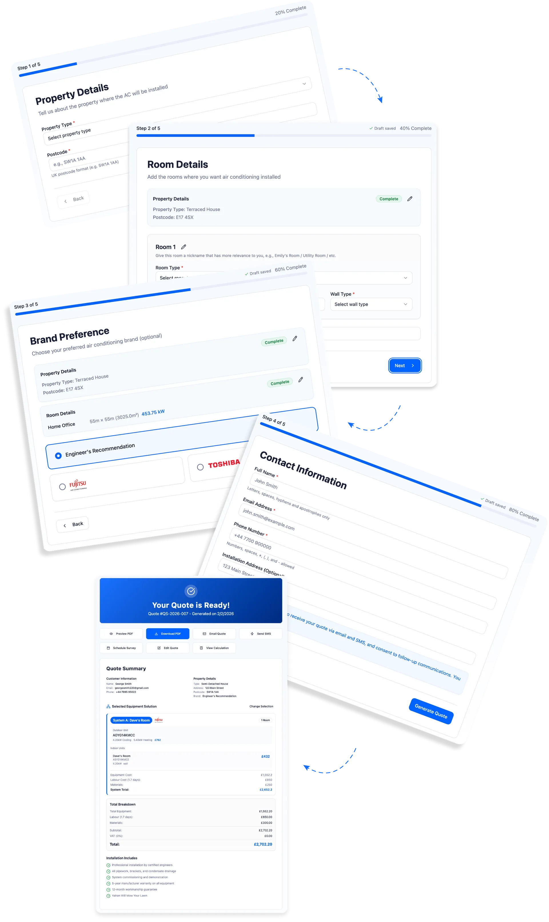 Customers complete a multi-step form (designed to reduce drop-off), and can return to drafts that auto-save. Once the quote is ready, they receive a branded quote and next-step messaging.