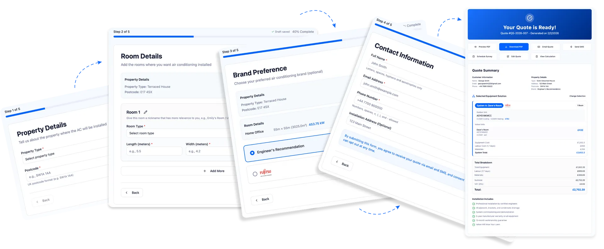 Quotestack helps Air Conditioning engineers generate accurate, professional quotes faster by guiding customers through a structured quote request, auto-sizing requirements, selecting equipment from your uploaded catalogues, and producing a branded quote output.