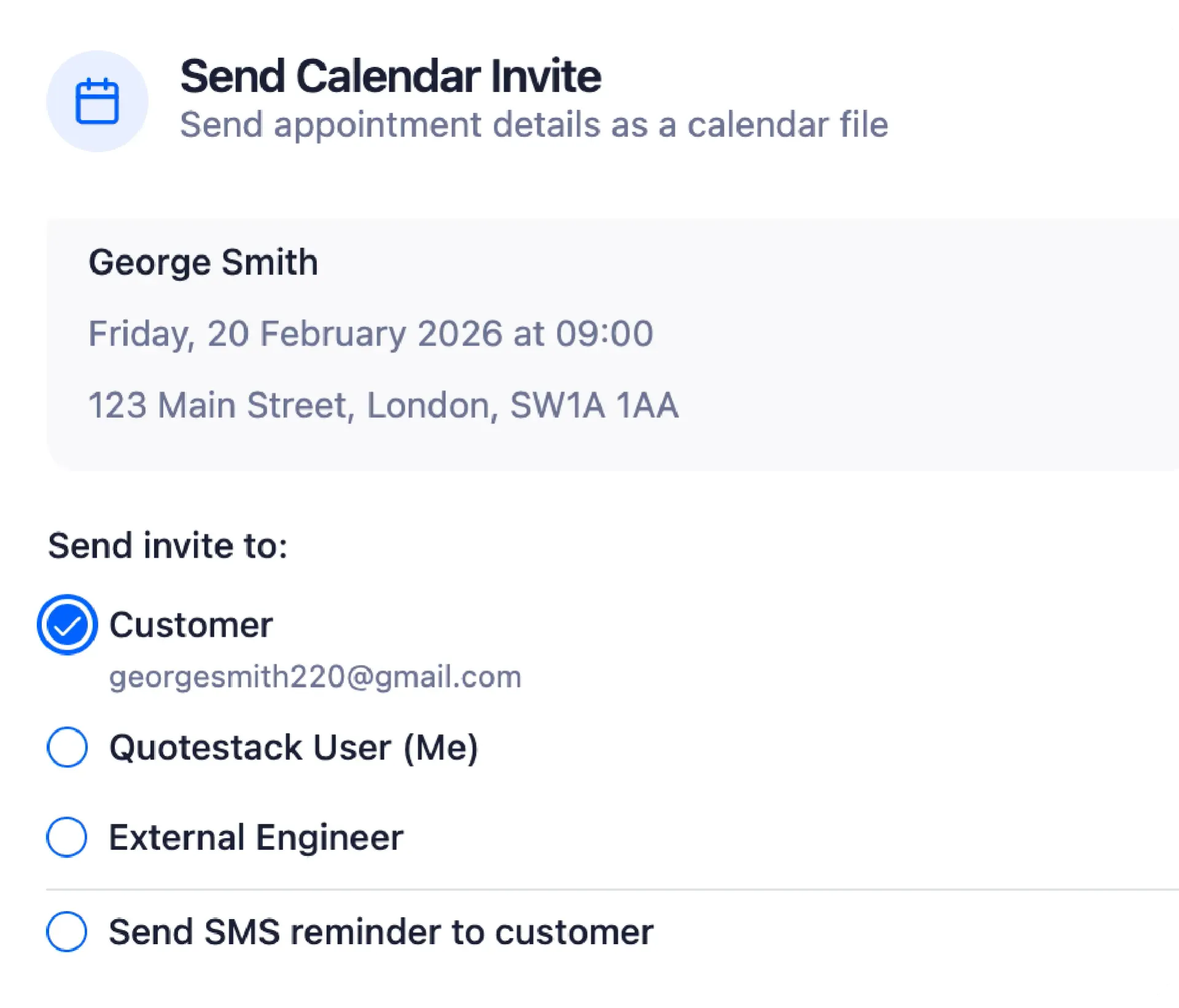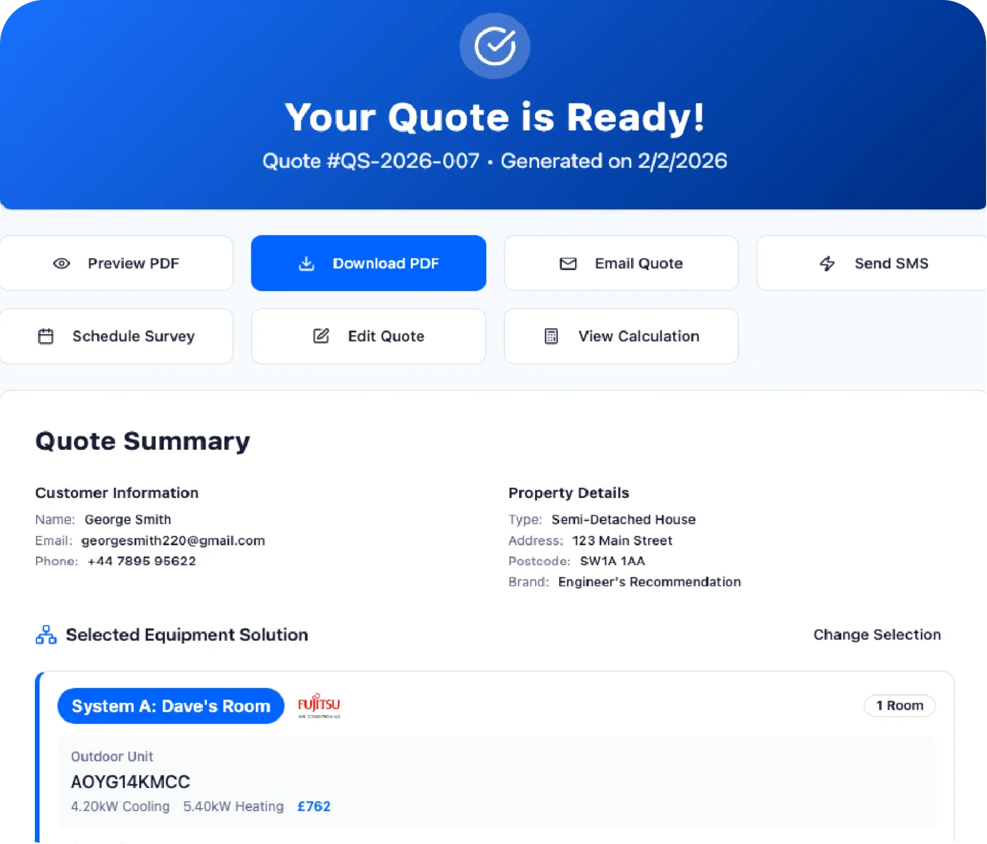 Quotestack supports a “pre-survey quote” approach: the customer receives an estimate, then books a site survey, after which the engineer can revise the quote if needed.