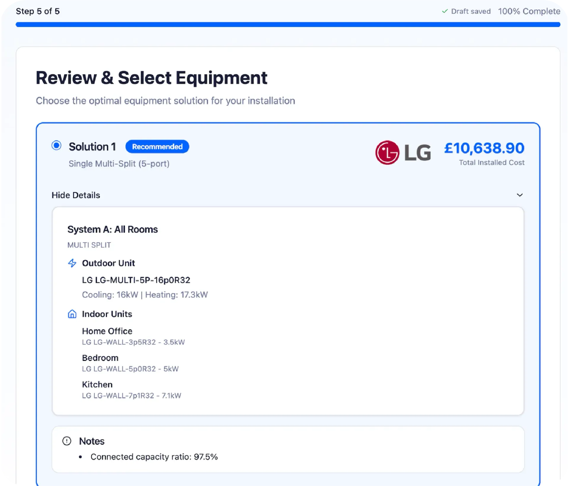 Yes. You can configure the brands you use and upload catalogues so the system can select appropriate equipment based on required output and your pricing.